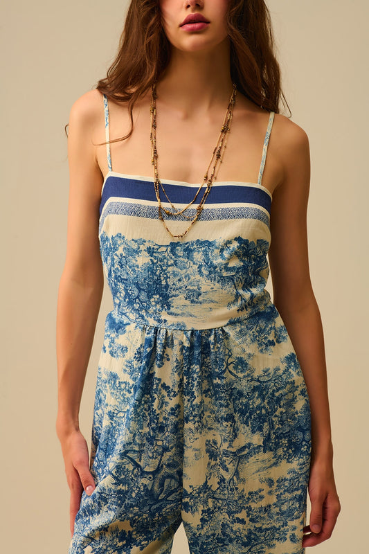 Toile de Jouy Print Jumpsuit with Thin Straps