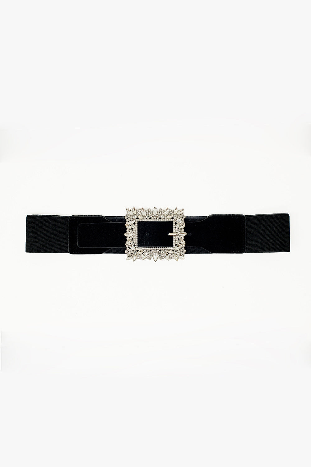 Cinturón de terciopelo elástico negro con cierre metálico.
