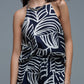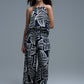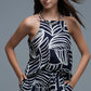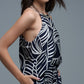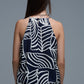 This stunning top showcases a bold sleeveless design with a chic halter neckline making it a standout choice for any warm-weather occasion. The striking white leaf print beautifully contrasts with the rich Navy and White fabric elevated by a stylish white pattern that exudes sophistication. With a flared silhouette that guarantees a flattering fit this piece is not just comfortable but also effortlessly stylish. The longer back adds a contemporary flair proving that lightweight fabric can be both functional and fabulous.