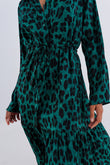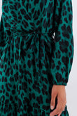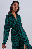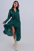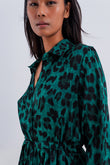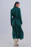 Longitud máxima. Vestido. Escote cuello ancho. Mangas Largas. Huella animal. Forma relajada. boho Dobladillo escalonado. Tela tejida ligera. Tapeta de botones. Totalmente forrado. Cintura con cordón elástico. funciona fiel al tamaño. S.