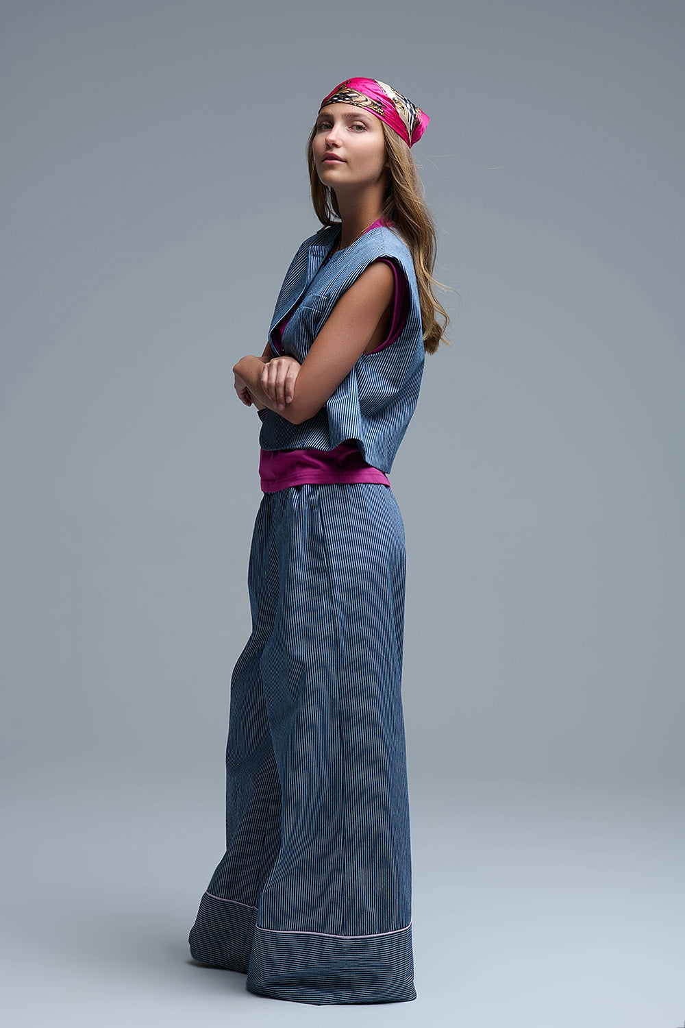 Discover our delightful blue and white striped crew neck vest designed for both comfort and style. This eye-catching piece features a vibrant pink chest pocket that adds a splash of color and personality. The vest is thoughtfully buttoned down the front with matching blue buttons ensuring a secure fit while enhancing its fashionable appeal. Perfect for layering or as a standalone statement this vest is a must-have addition to your wardrobe that effortlessly combines casual charm with a refined touch. The item features a delightful fuchsia lining.