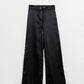 These trousers feature a trendy long design with a high waist that beautifully accentuates the figure. The wide-leg cut offers a relaxed silhouette allowing for comfortable movement while maintaining a stylish appearance. Crafted in a classic plain black fabric with a luxurious satin finish these trousers exude elegance. The relaxed fit ensures all-day comfort while the elastic waistband combined with an adjustable drawstring provides a customizable fit. Additionally the front pleats add a touch of sophistication making them suitable for both casual outings and more formal events.